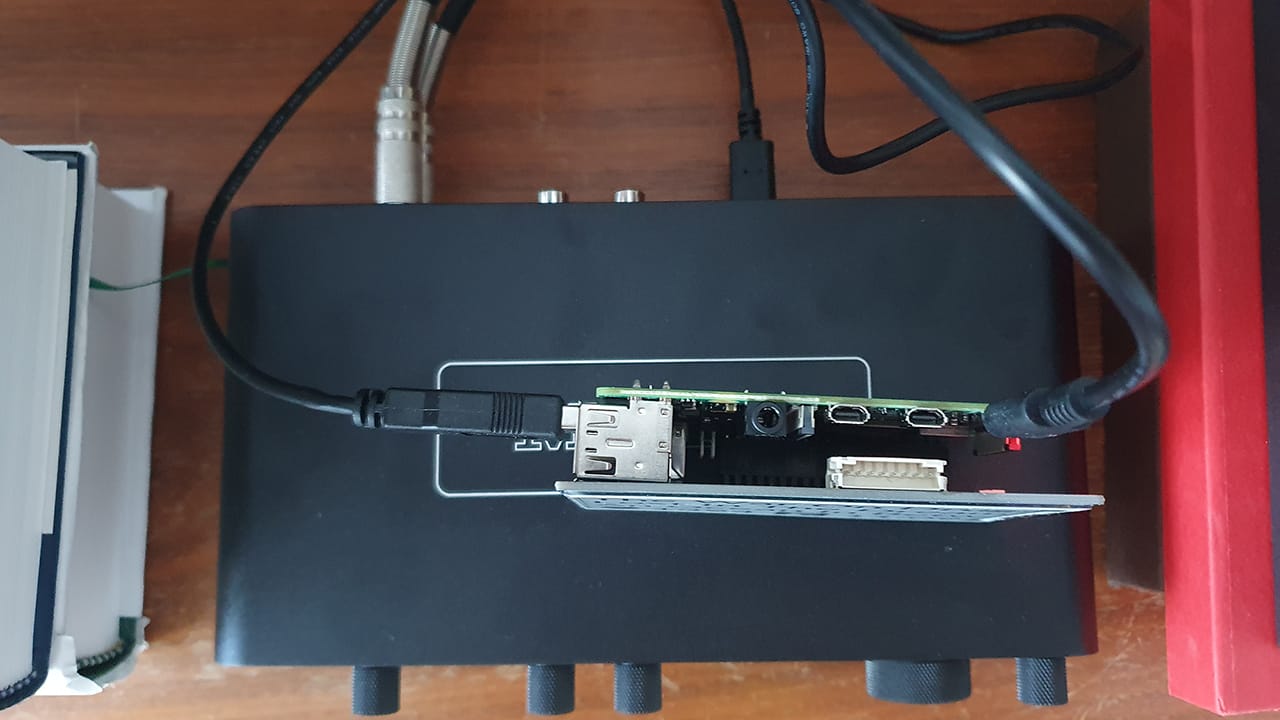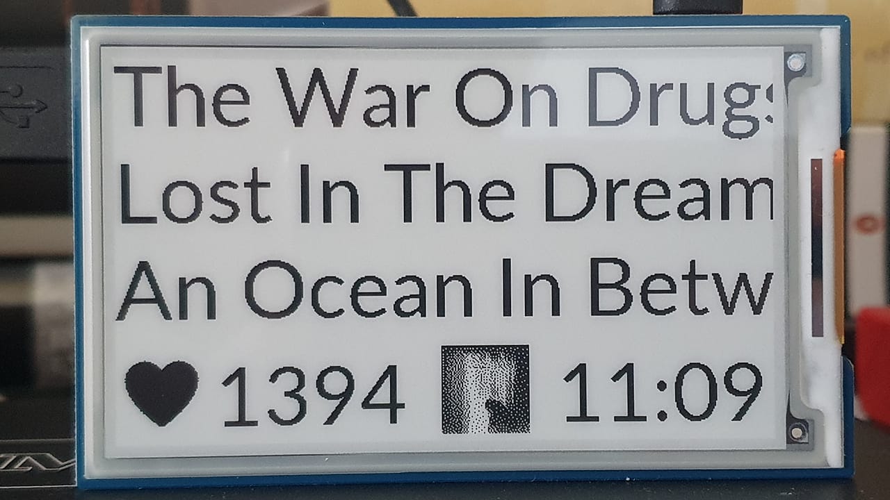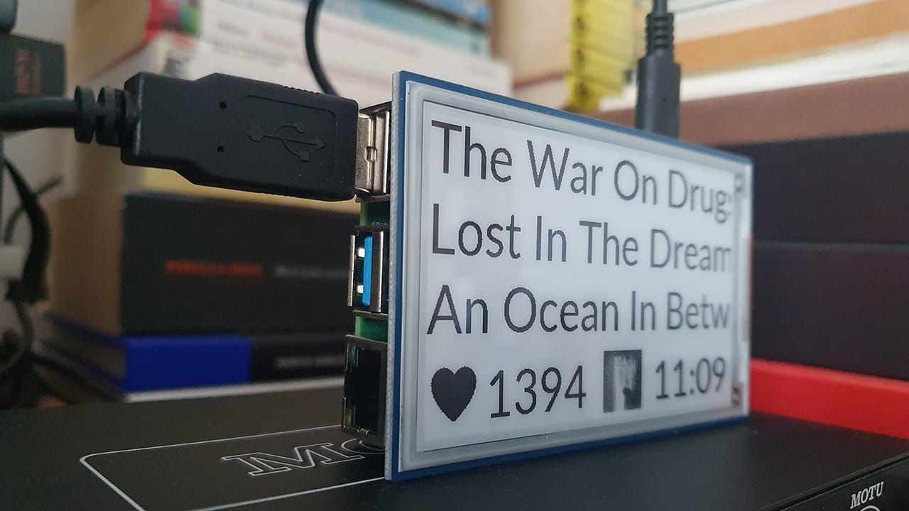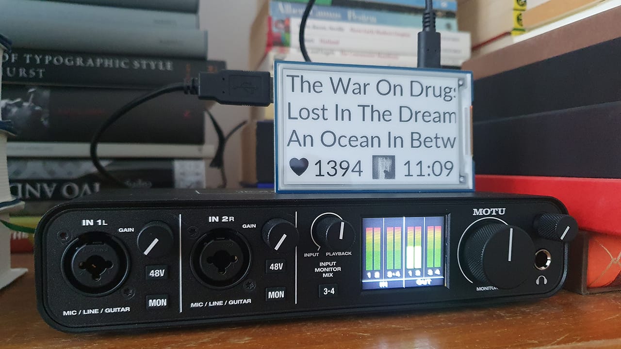 I've been using a Raspberry Pi 3 for years with a DAC HAT connected to a pair of powered monitors. I thought it was time to upgrade to a Raspberry Pi 4. This time, I opted for a USB DAC: the MOTU M4. I also wanted to hide the Raspberry Pi behind a display. The Waveshare 3.7 e-ink display seemed to cover the whole Raspberry Pi and also attach to it nicely. It has support for partial refreshes and is fairly fast at updating the whole screen. It sits on top of the MOTU M4 and shows some music information (from LastFM's API) like track name, album, artist, play count and the time of day. For now, I'm not using the partial refresh, but plan to in the future. Instead, I only update the screen once a track changes (so the time is usually lagging a few minutes). The Python code can be found here: media screen.